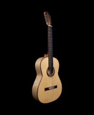 My beautiful flame maple and spruce guitar..it gets better and better. It really does! It is my first fretless and a baritone is coming too. It’s a new way of playing and listening to music. And it really sings. Rich,lush tones that hang in the air..Canoral guitars are excellent..no doubt. Sympathetic discussions about the guitar you want and efficient and prompt building .. excellent people to deal with..Highly recommended!